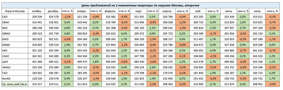 В июле изменение цен в сегменте 1-комнатных квартир было разнонаправленным. Лидером роста стал ЗелАО, +1,7%. Снизились цены более всего в ЮАО (-1,2%).